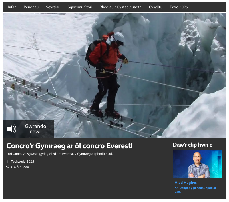 Tori also gave her first Welsh-language radio interview with Aled Hughes, discussing Everest, learning Welsh, her podcast First Females, and the film More Than a Mountain.